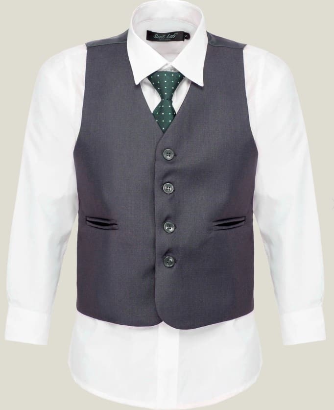 Boys 3 Piece Charcoal Suit. Comes with Jacket, Vest and pants, shirt and tie are NOT included. Please refer to size chart to get the best fit.