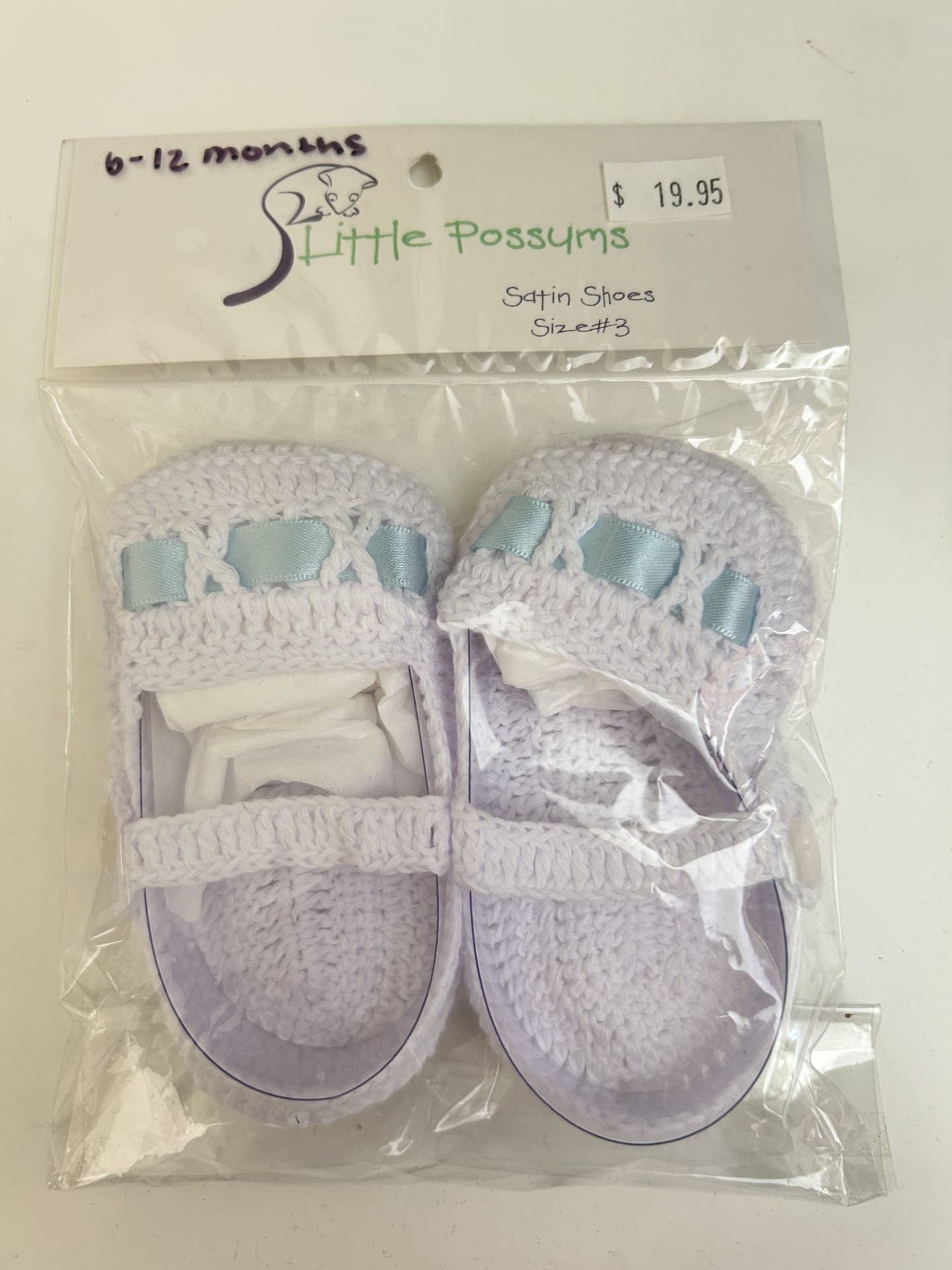 White Crochet Baby booties with Blue ribbon.
